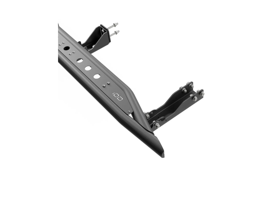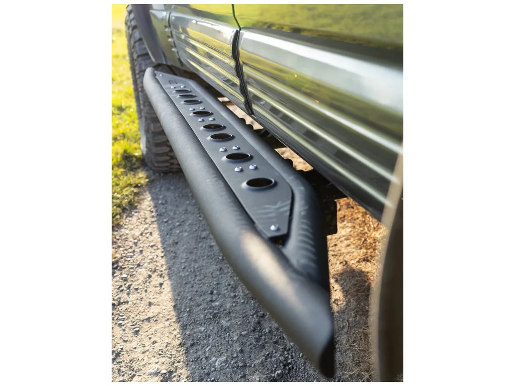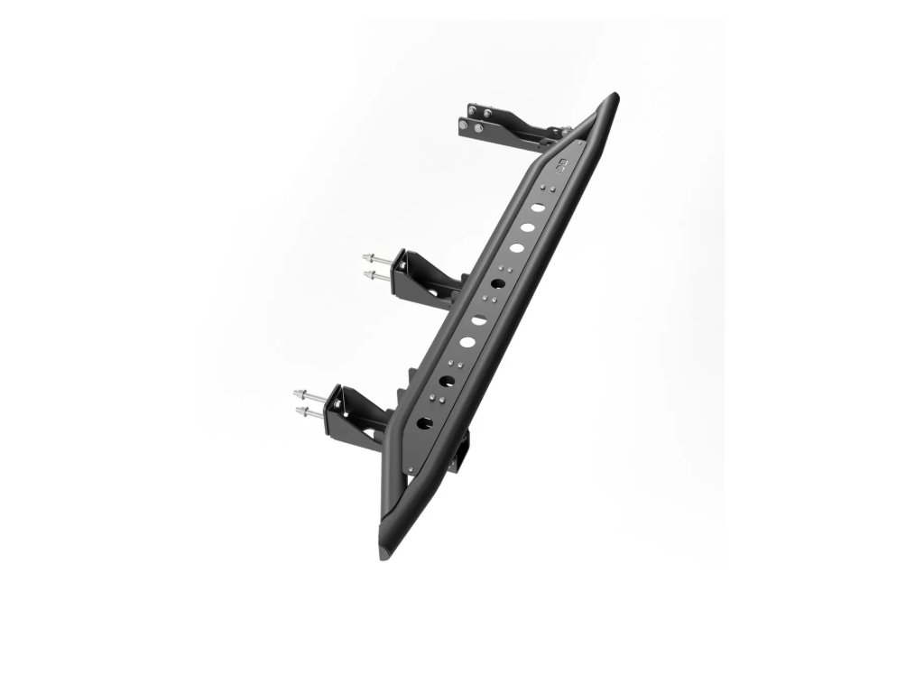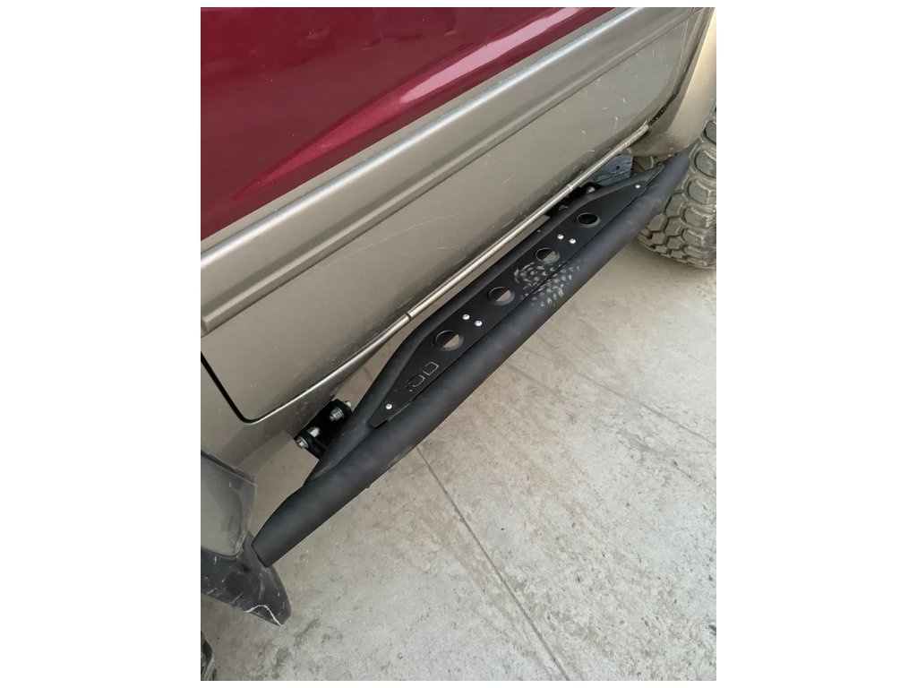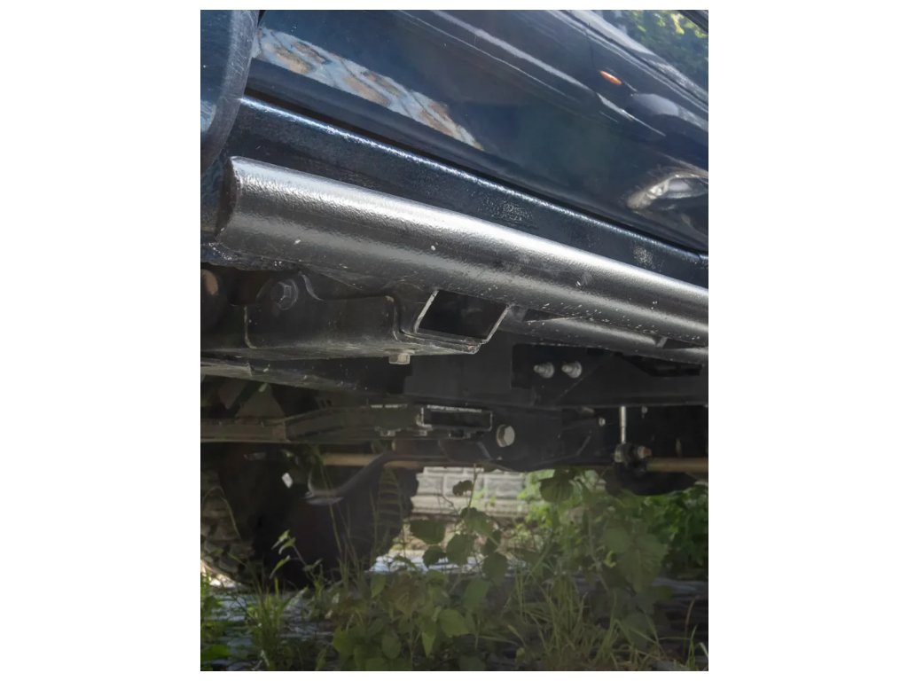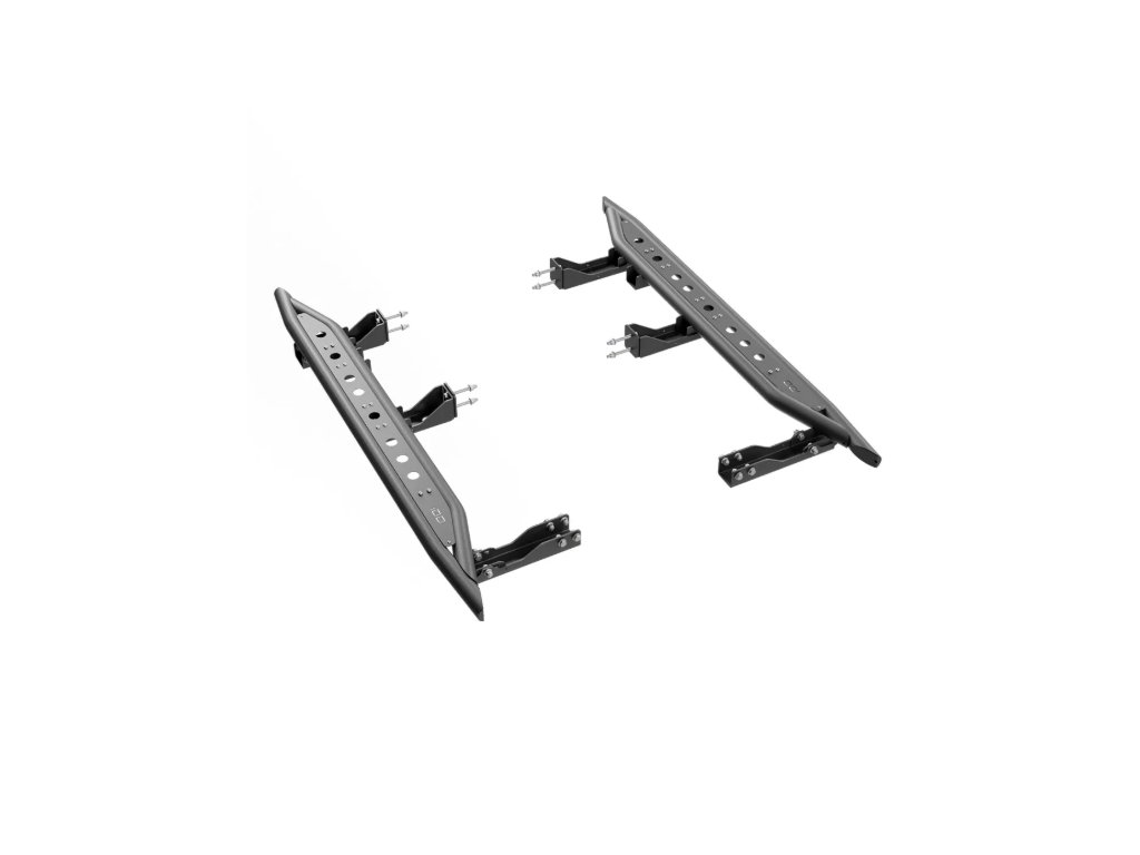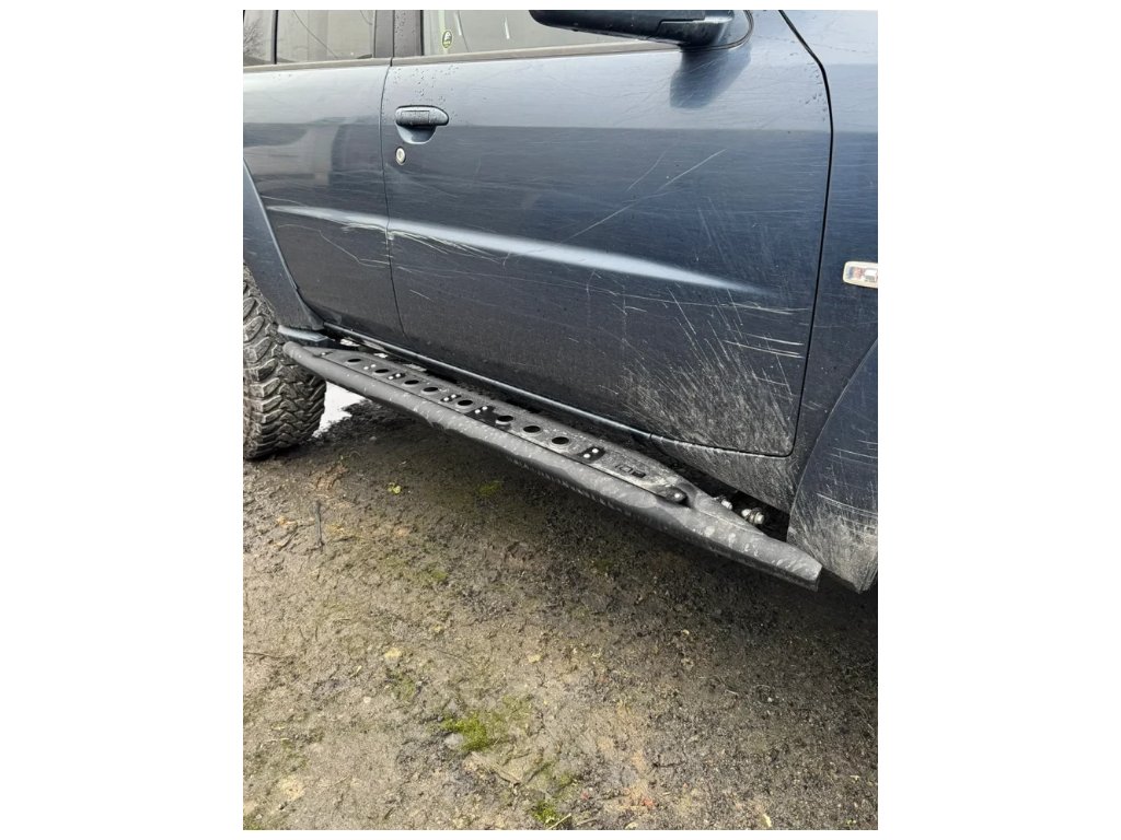Odolné terénne prahy pre Nissan Patrol – oceľová konštrukcia s protišmykovými rebrami a trojbodovým upevnením na rám. Chránia karosériu, umožňujú zdvihnutie auta a ponúkajú nastaviteľnú vzdialenosť od karosérie.